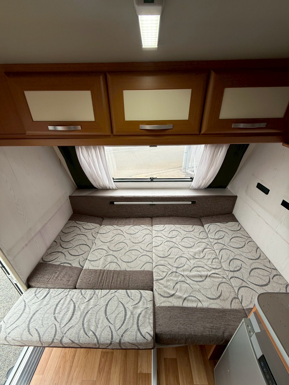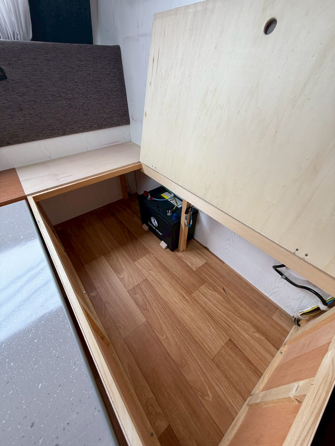 ソファー下の収納部分に12vのバッテリー(ディープサイクルバッテリー1個 ブライトスター27MF )が入っています。 購入時サービスでバッテリーは交換します